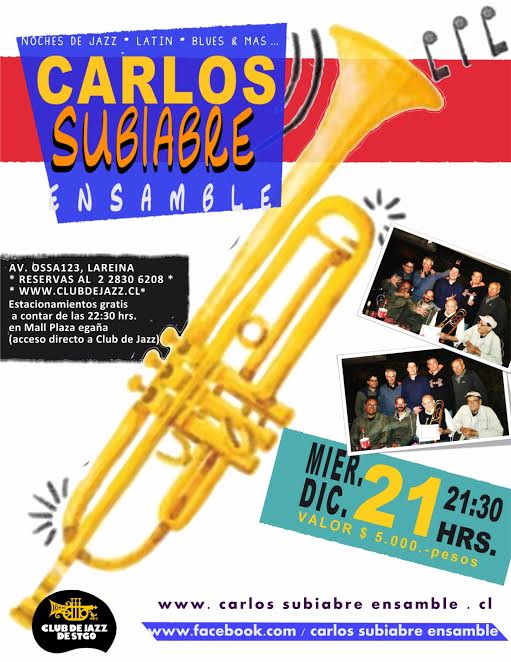 Carlos Soubiabre Ensamble / Jazz Standard, Miércoles 21 de Diciembre a las 21:30 hrs, Valor $ 5.000